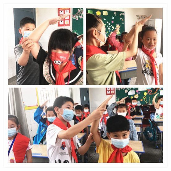 “领巾披上肩,左肩压右肩。”“敬队礼表示人民的利益高于一切。”在大队部的哥哥姐姐和老师们的耐心指导下,孩子们认真地学习着系红领巾、敬队礼,脸上洋溢着幸福的笑容。